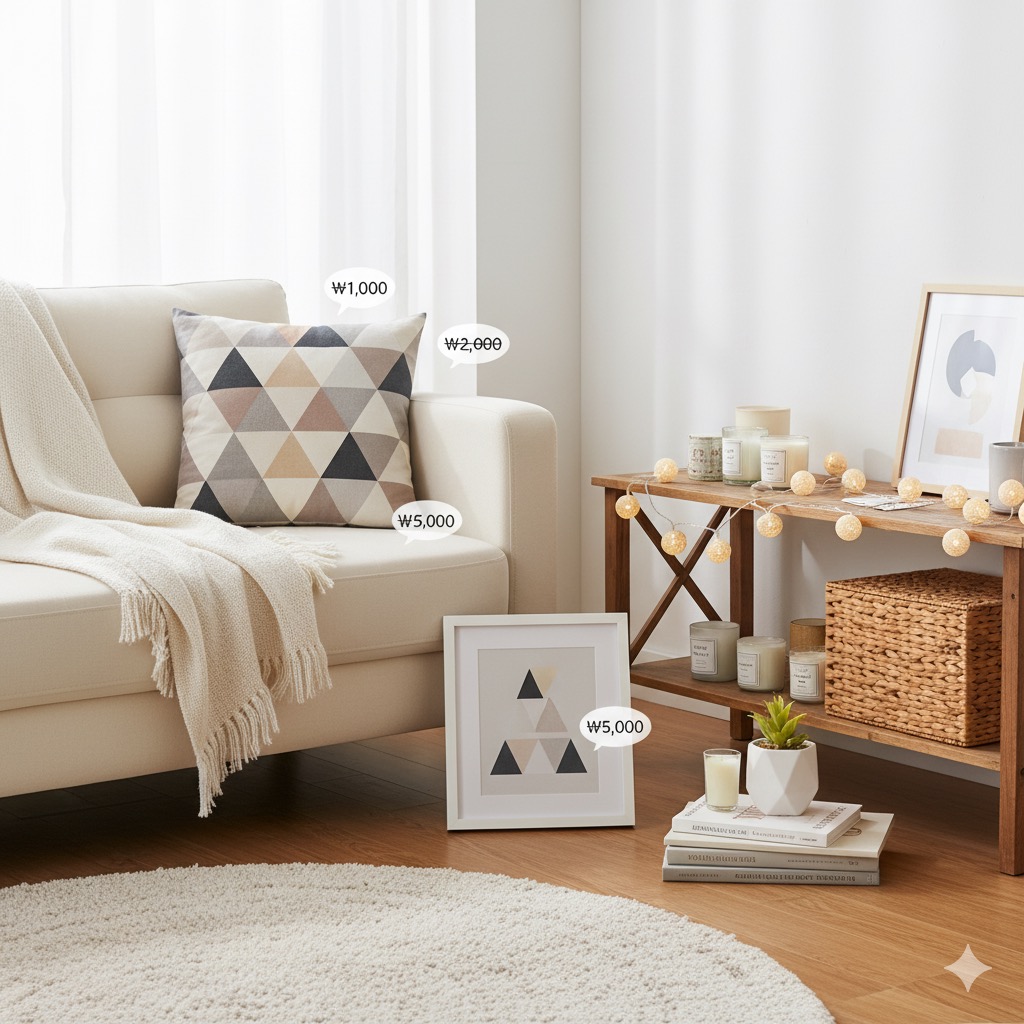 - 재질 통일: 우드·유리·패브릭 등 소재를 통일하면 저렴한 소품도 더 고급스러워 보임